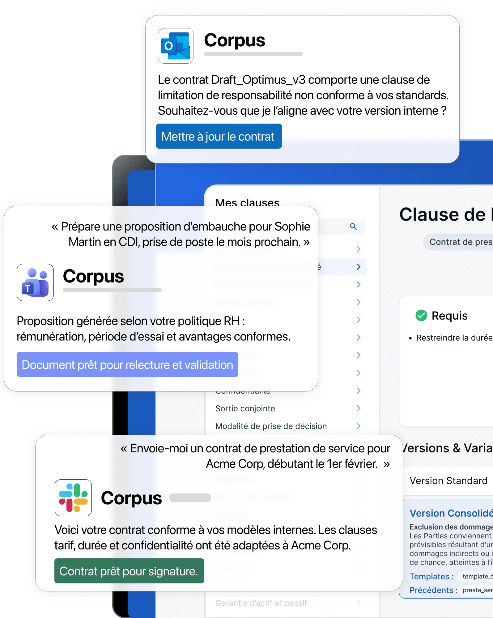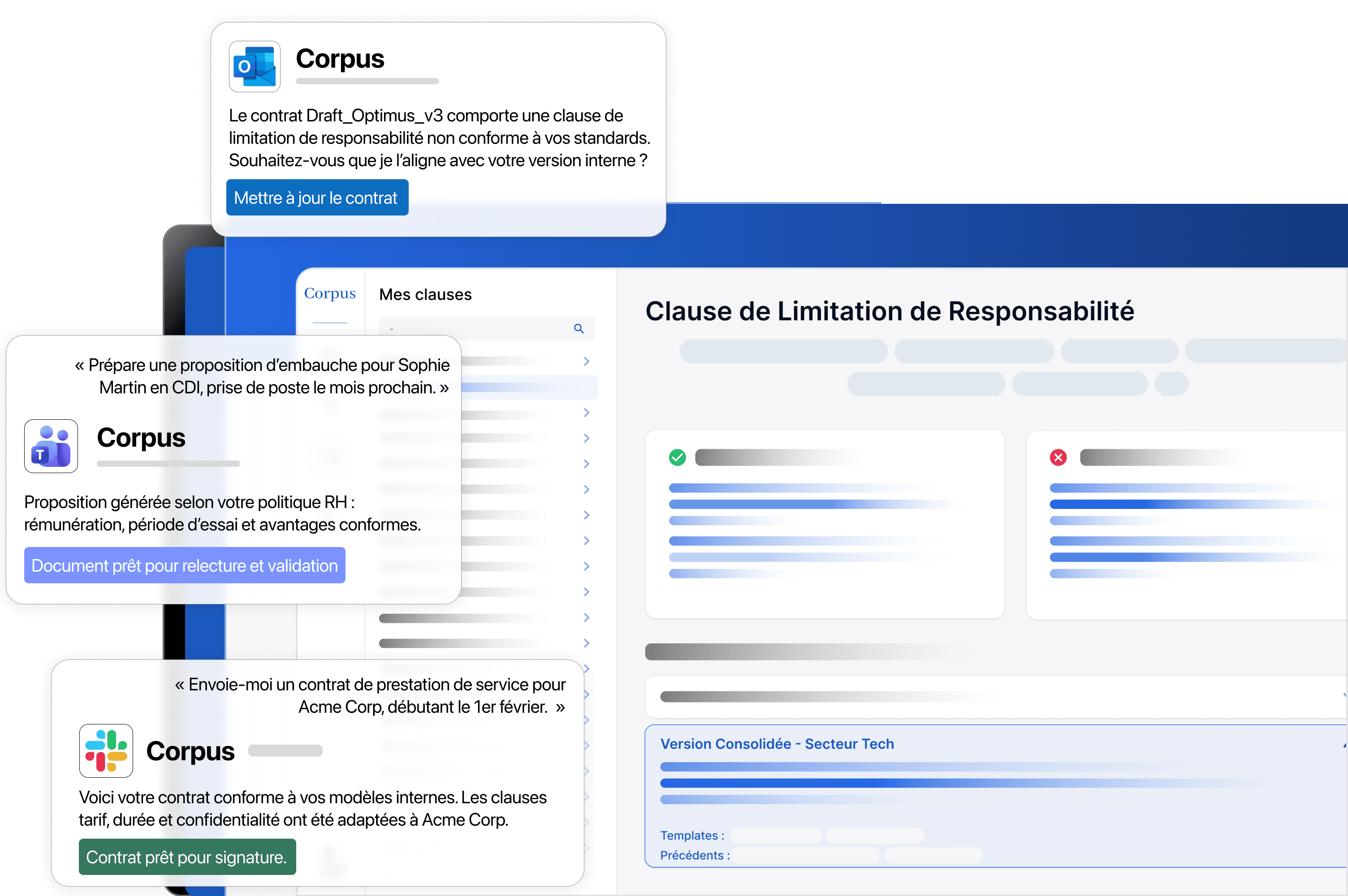 Corpus s’intègre nativement à Word, Outlook, Teams et Slack, pour automatiser la rédaction, la revue et la validation contractuelle sans changer vos usages.